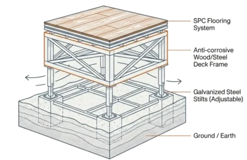 A premium flooring system does more than look good; it acts as a structural anchor and a thermal barrier against the cold, damp ground. In professional glamping, we view the floor as a multi-layered system designed for stability, moisture protection, and barefoot comfort.