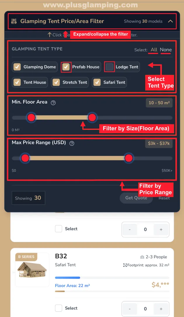 Filter by Size (Floor Area): Whether you need a cozy 13m² a-frame safari tent for couples or a spacious 60m² suite for families, simply drag the "Min. Floor Area" slider to find tents that match your space constraints.