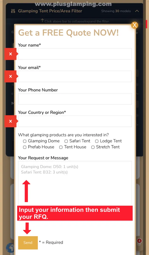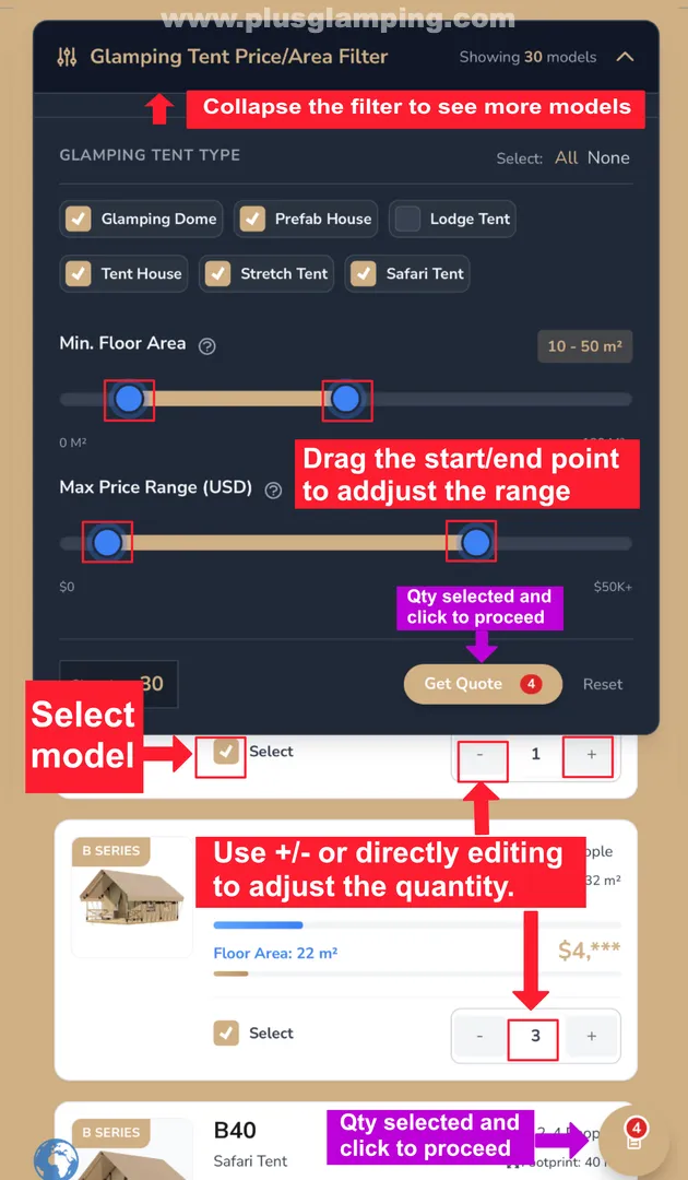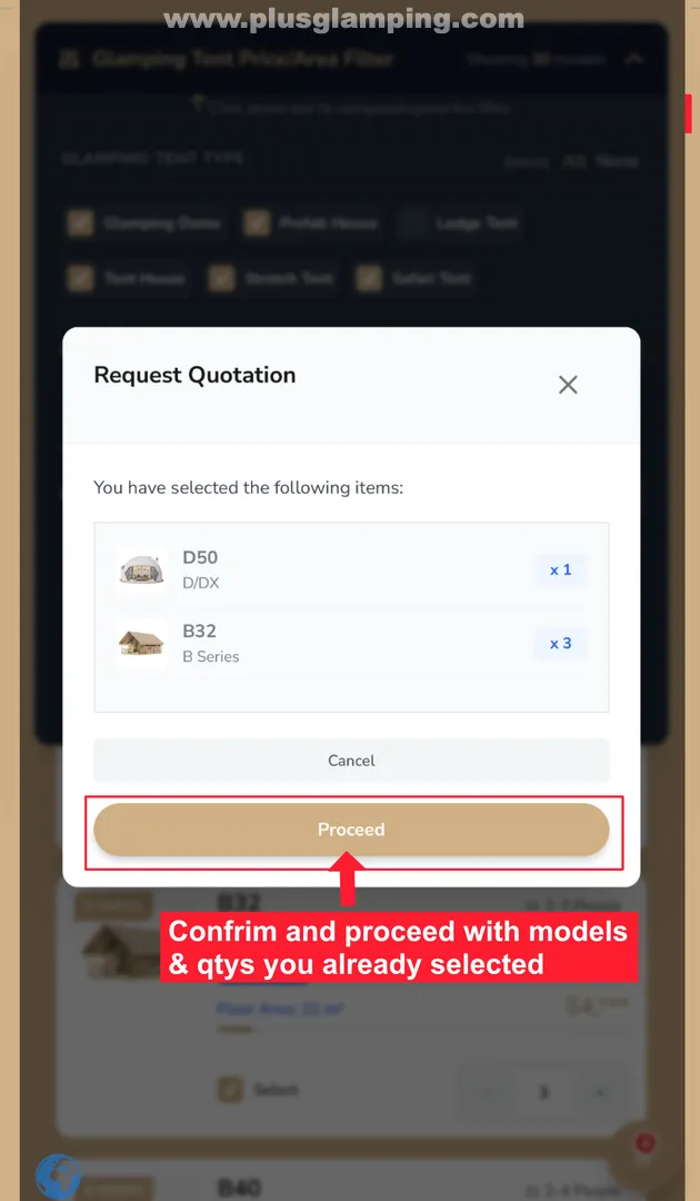 - Select Glamping Tent Models and Input the Qtys