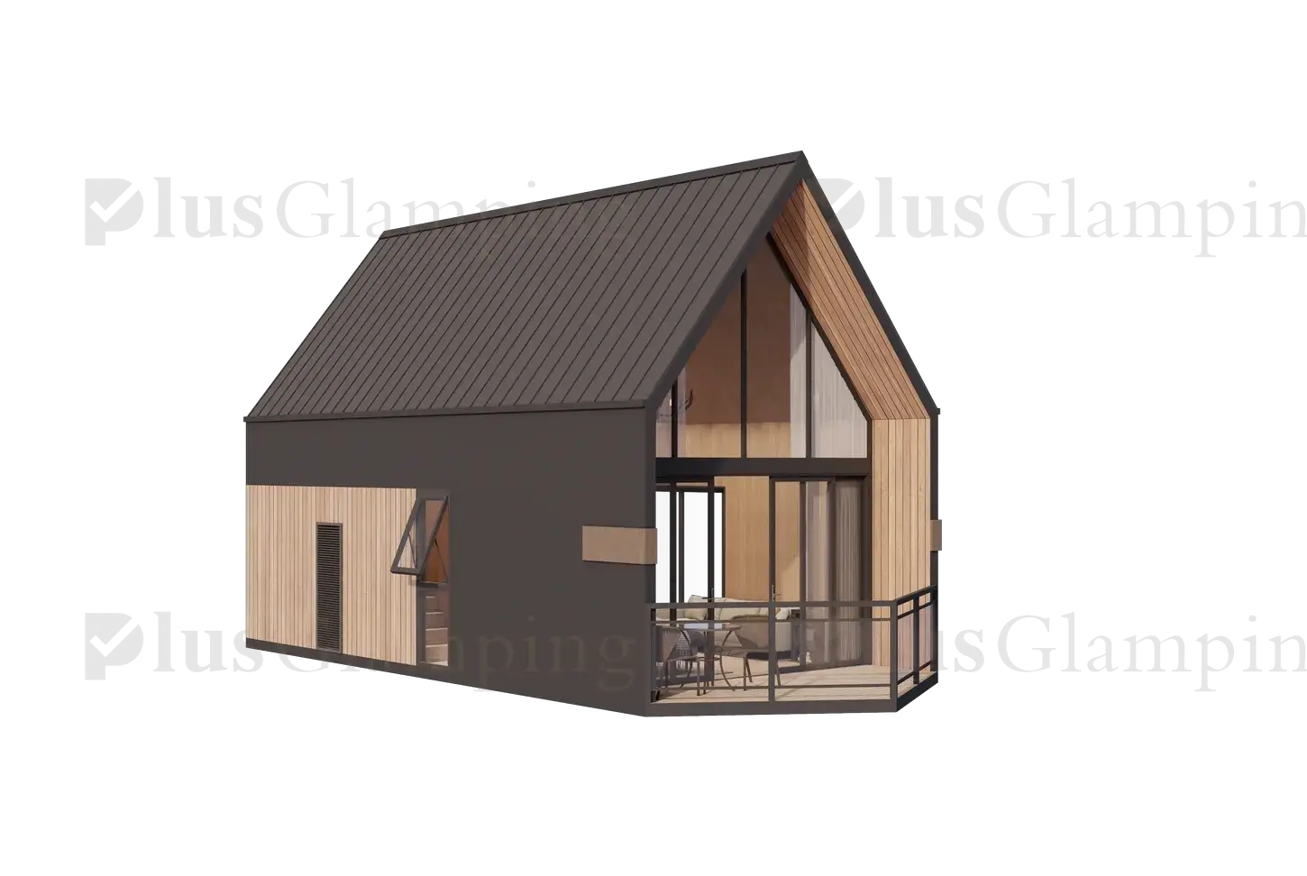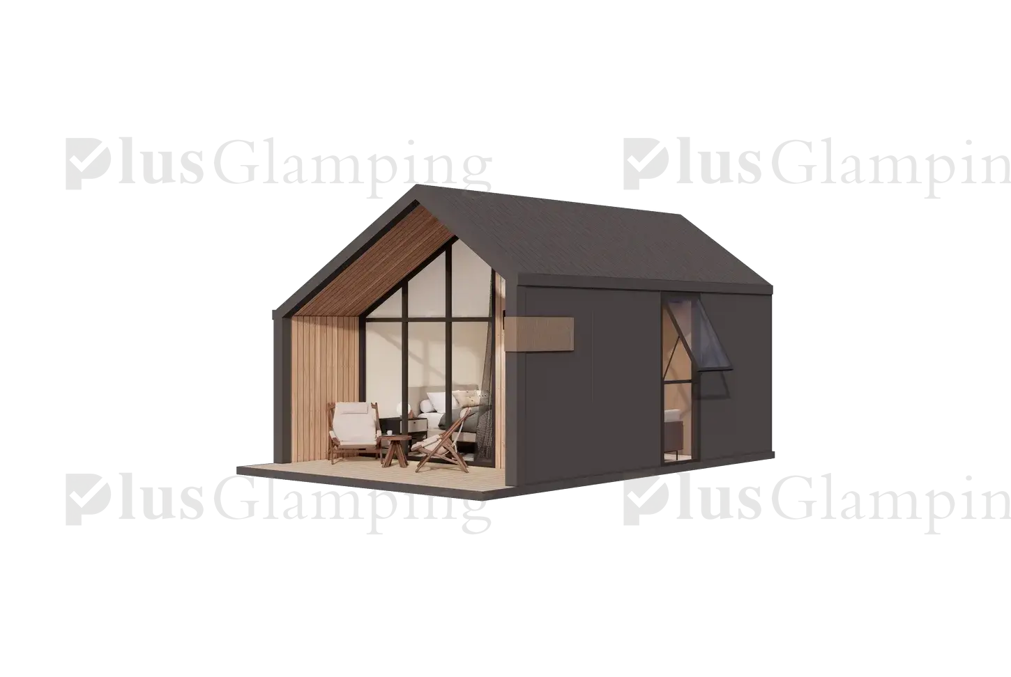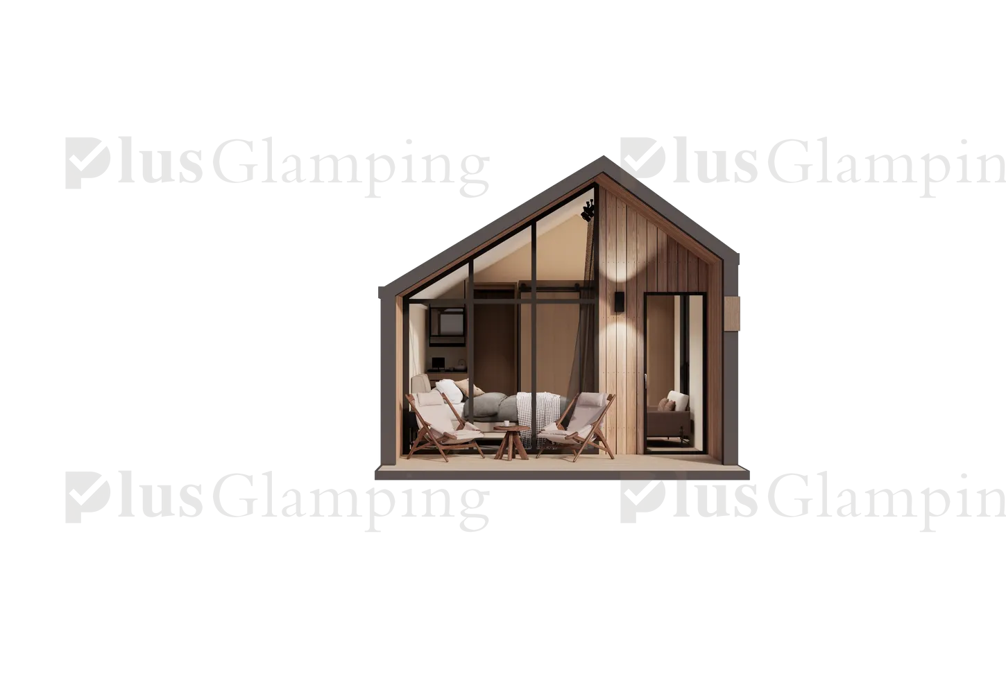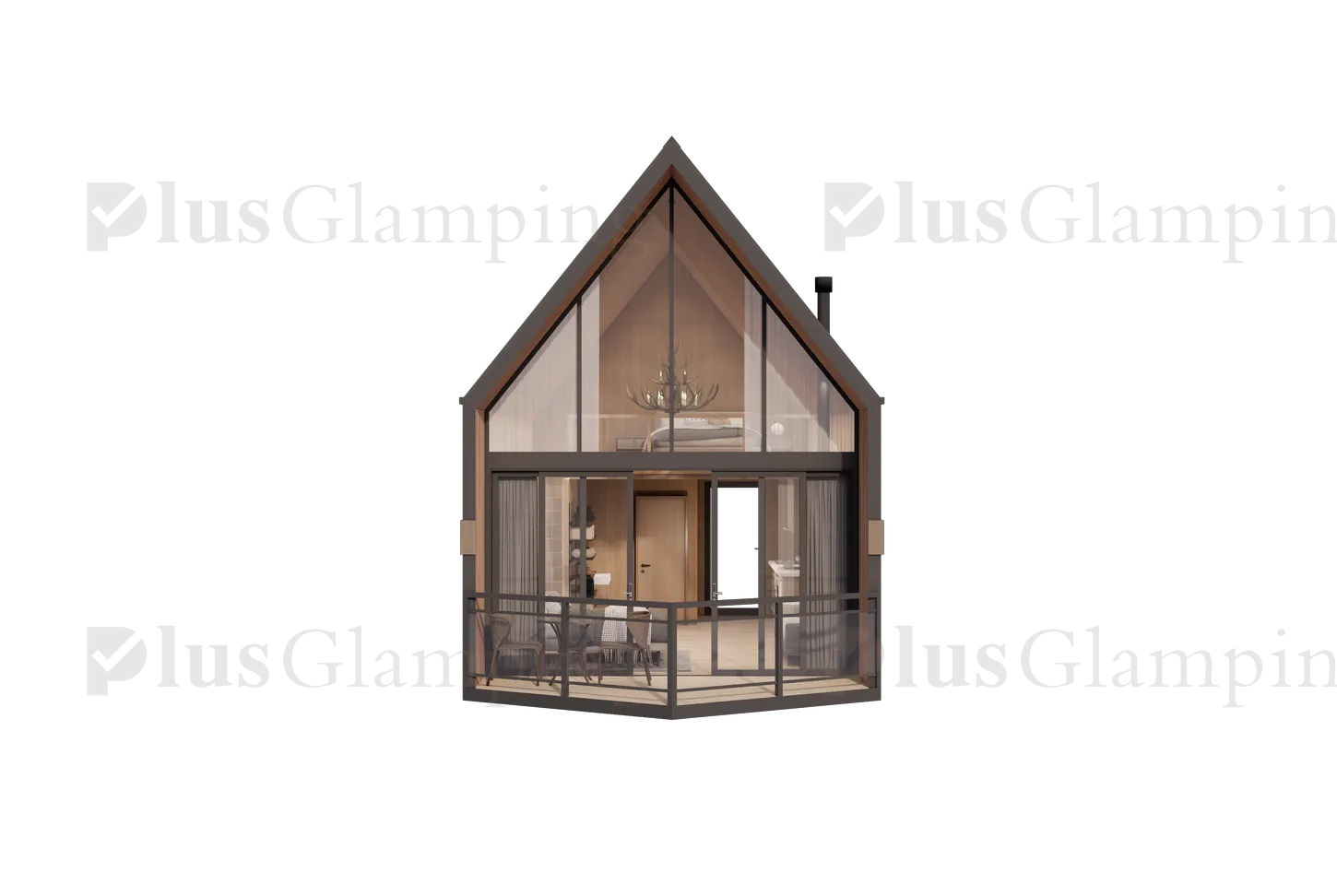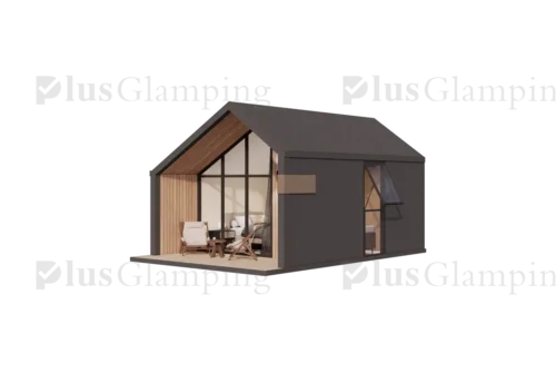 Single-Story Glamping Cabins (N3 & N5): Our single-story cabins deliver an iconic A-frame look with two distinct floor plans. The compact N3 features a bold, asymmetrical roofline for a contemporary edge, while the spacious N5 offers a timeless, symmetrical design. Both models prioritize floor-to-ceiling vistas and high-end finishes.