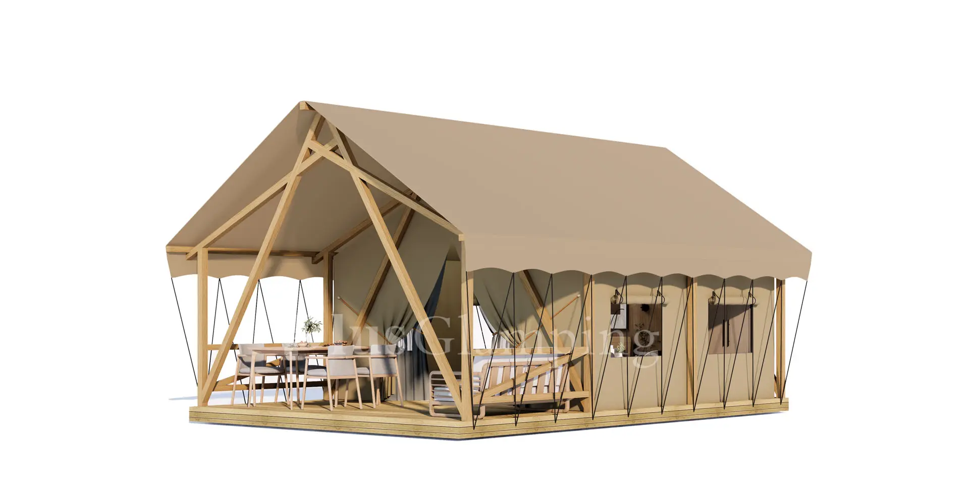 This E Series safari tent also has a large front balcony, PVC fabric top roof, and specially selected PVC and canvas fabric with flame retardant, 100% waterproof, UV resistance, tear resistance, and self-cleaning ability.