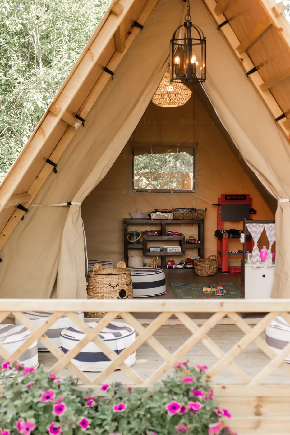 Each tent is equipped with modern amenities such as underfloor heating and fans, custom furniture, chandeliers, and decorative plants.